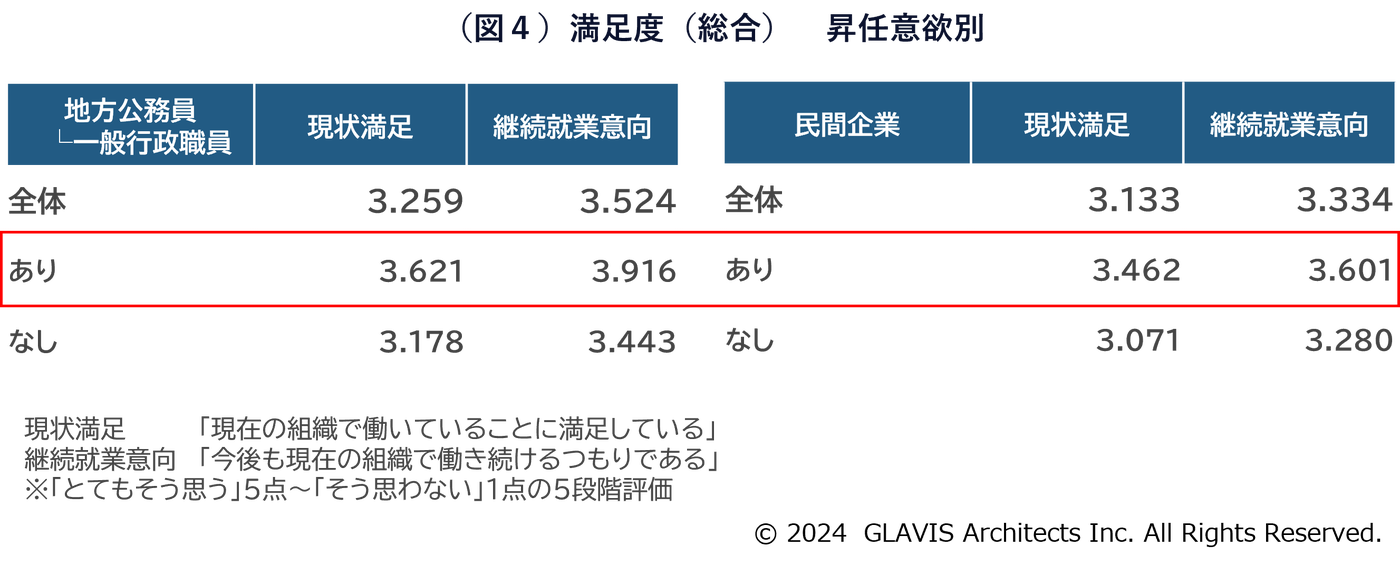 また「昇任意欲あり」の総合満足度は「意欲がない」と比較して高く、これは地方公務員、民間企業いずれも同じ傾向です。その中でも目指す職位が高いほど、総合満足度も高くなる傾向にあり、こちらも地方公務員、民間企業同様の傾向です。(図4参照)